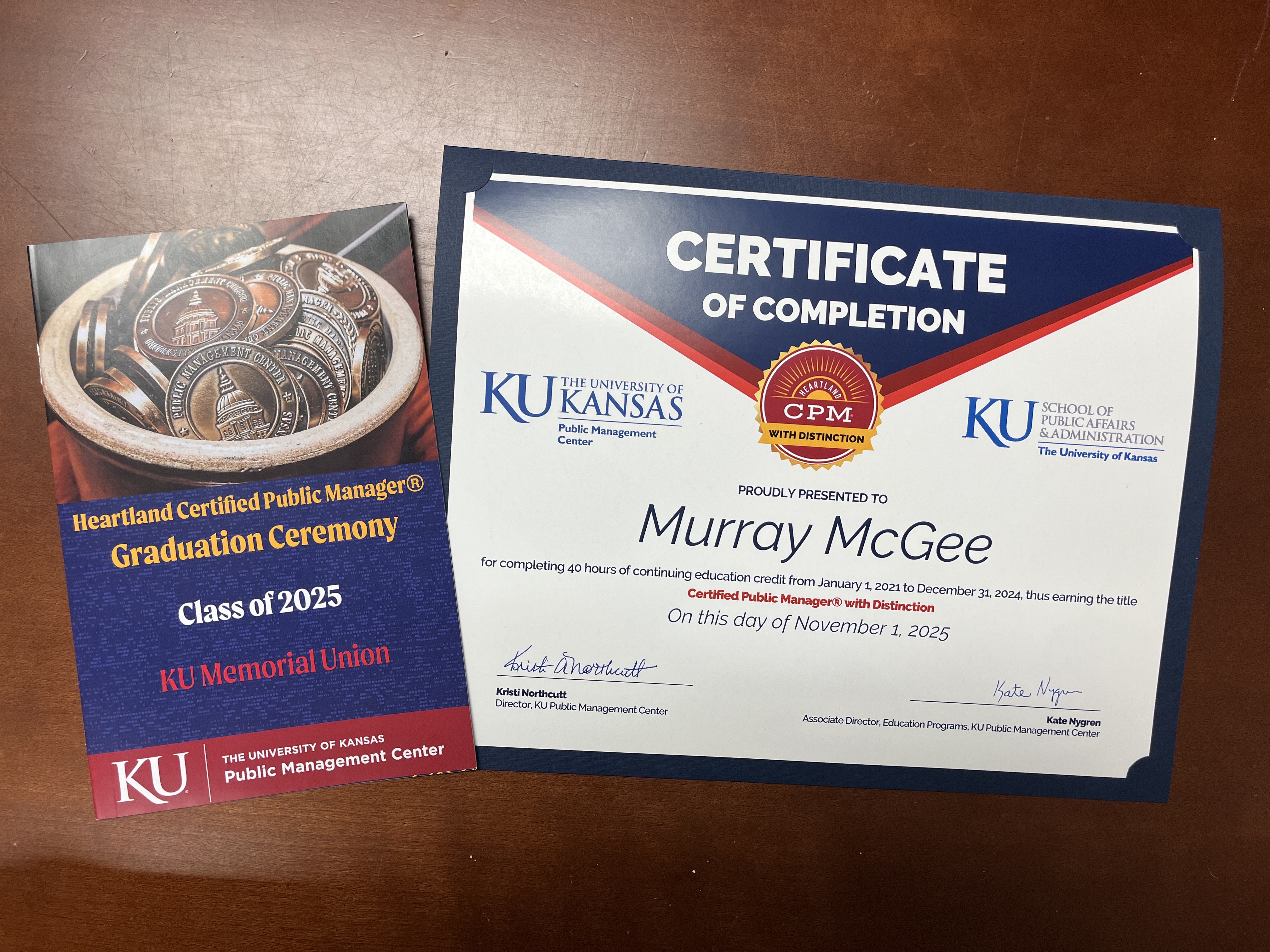 Information Network of Kansas, Executive Director Murray McGee recently received special recognition from the University of Kansas Public Management Center. Earlier this month, KU honored their 2025 Heartland Certified Public Manager Program (CPM) graduating class which included INK Board Member Kayla Savage from the Kansas Department of Commerce.